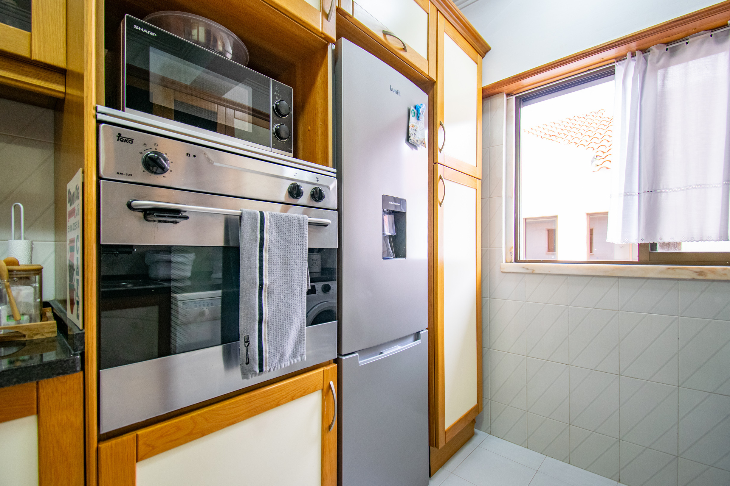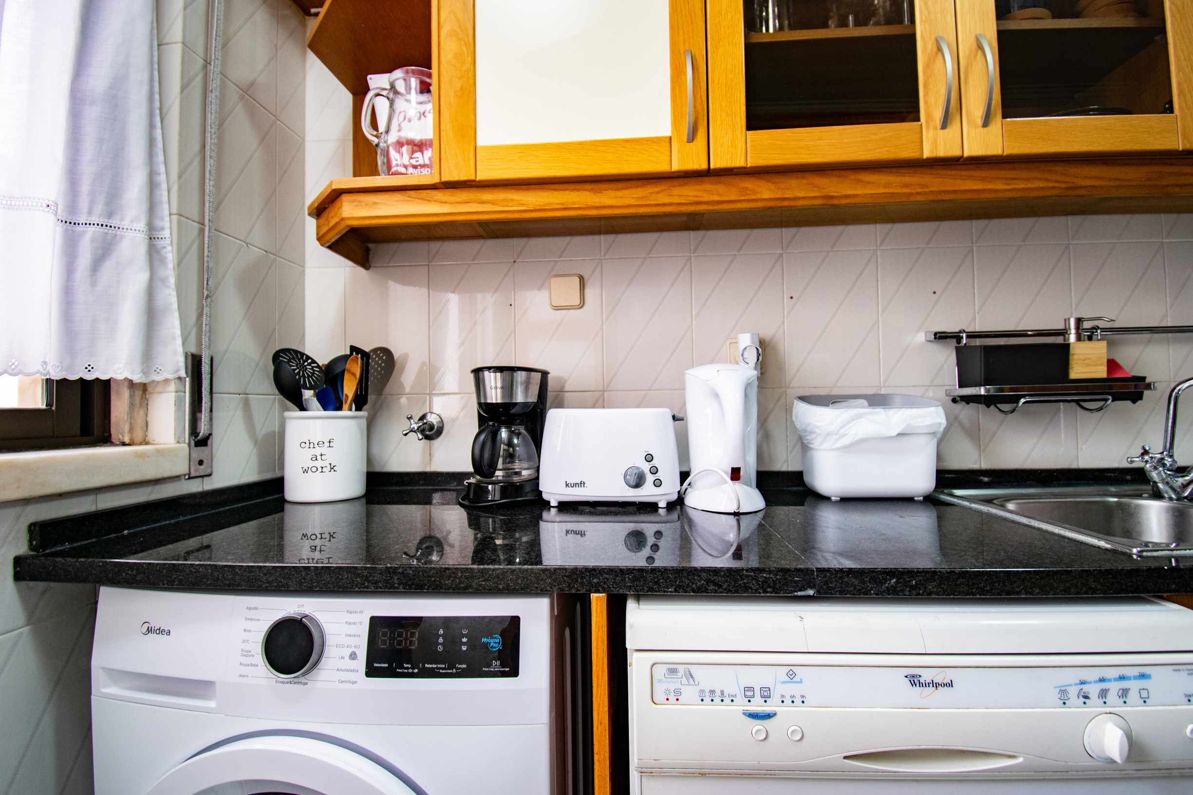 A cozinha, está equipada com frigorífico, microondas, forno, congelador, máquina de lavar louça, louça/talheres, utensílios/cozinha, máquina de café, torradeira e jarro eléctrico.